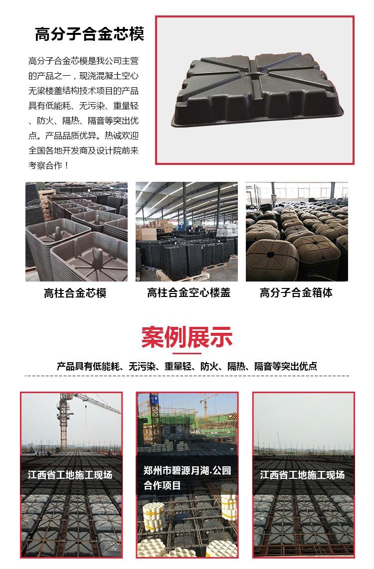 空心樓蓋適用于辦公樓宇、倉庫廠房、地下車庫、立交橋、大型商場、學(xué)校教學(xué)樓以及圖書館等大跨度的建筑。